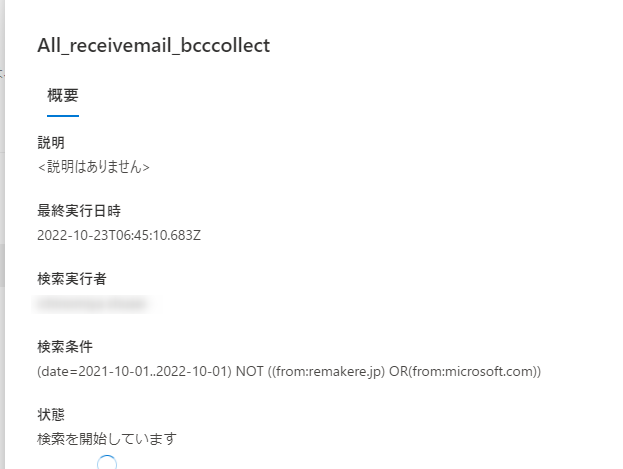 ↓適当な例New-ComplianceSearch -Name "All_mail_bcccollect" -ExchangeLocation bcc_collect@remakere.jp -ContentMatchQuery '(date=2021-10-01..2022-10-01) NOT ((from:remakere.jp) OR(from:microsoft.com))'