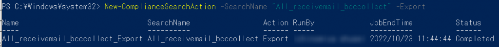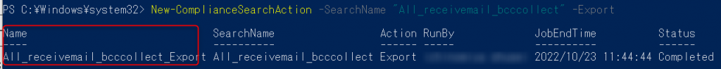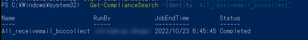 今回の例だと、下記のようになります。Start-ComplianceSearch -Identity "All_mail_bcccollect"