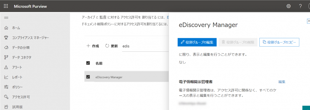Microsoft Purview→ アクセス許可 → eDiscovery Manager→電子情報開示管理者
