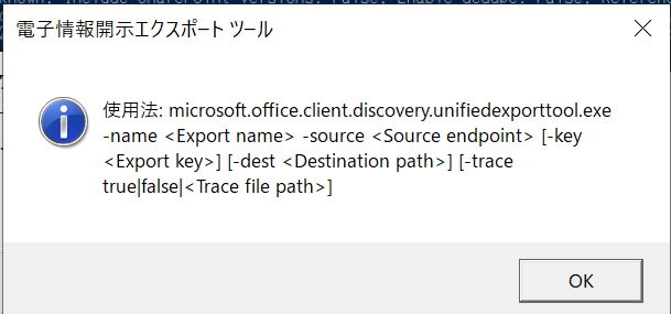 電子情報開示エクスポートツールをインストールして、何も引数与えないまま、起動しようとすると下記のような画面が表示されます。