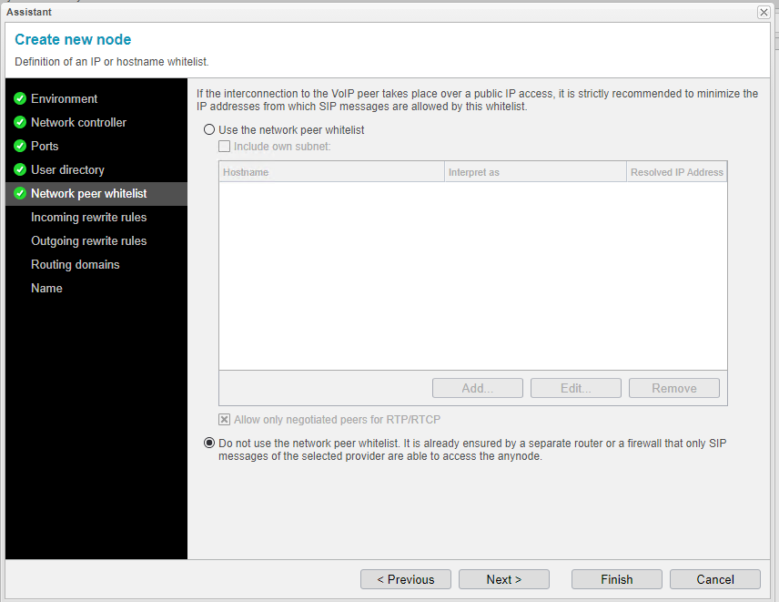 本来は、ソフトフォンは特定のIPからのみ接続を許可すべきですが、今回は「Do not use the network peer whitelist」を選択して、まずは検証を進めます。