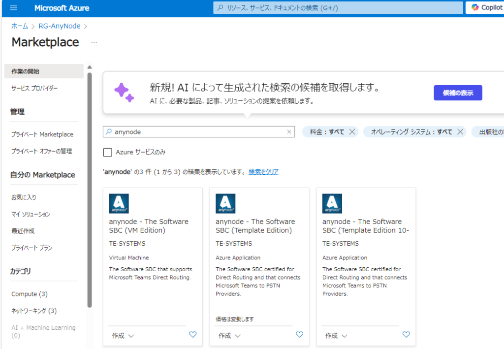 Anynode自体は、Azure Marketplaceに存在するので、これを利用します。