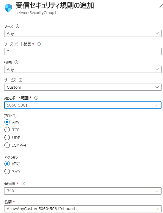5060番と5061番を許可設定します。(本番環境では、ソースIPを絞るなどしてください。)