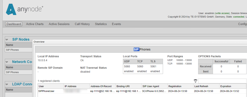 無事に、3CXのソフトフォンと、Anynodeがつながった後は、3CX側がOn Hook状態になり、また、Anynode側ではMonitorからどのデバイスが繋がっているか確認することができます。